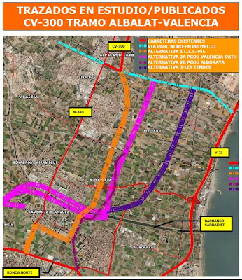 La Conselleria d’Infraestructuras i Transport pretén prolongar la CV-300 (tram Albalat-València) per l’horta de Meliana, Almássera i Alboraya.La carretera CV-300 correspon a la Conselleria d’Infraestructures. Forma part del PEU – Pla d’Infraestructures Estratègiques – l’Horitzó de realització del qual és 2004 -2010.